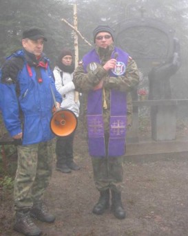 Wyruszyliśmy na trasę z Brzysk, z miejsca upamiętniającego poległych w tych okolicach żołnierzy w okresie I i II wojny światowej. Stąd już żółtym szlakiem, mijając kolejne stacje drogi krzyżowej szliśmy na szczyt góry Liwocz. Autorem projektu i wykonawcą stacji drogi krzyżowej jest artysta metaloplastyk Aram Shakhbazyan, z pochodzenia Ormianin, mieszkający w pobliżu Jasła. Każda ze stacji wykonana jest z miedzianej blachy metodą ręcznego wytłaczania. Całość umieszczona jest na wyciągniętych ku górze dłoniach, które z kolei wsparte są na ołtarzu, a wszystko to - w zamyśle autora - ma symbolizować, że na ołtarzu świata, ręce ludzkie ofiarowują Bogu Mękę Pańską, aby zaskarbić sobie jego miłosierdzie. Przed południem dotarliśmy na szczyt do sanktuarium Matki Bożej Królowej Pokoju, gdzie umieszczono figurę Matki Bożej przywiezioną tu z Medziugorja. Z tarasu położonego 20 metrów nad kaplicą, można podziwiać jeden z najrozleglejszych widoków na Pogórzu Ciężkowickim. Dookolna panorama pozwala nacieszyć się niezwykle pięknymi widokami najbliższych i dalszych okolic. Nam niestety takie widoki nie były dane z uwagi na gęstą i nisko wiszącą mgłę.
