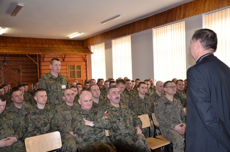 W swoim wystąpieniu Biskup przypomniał między innymi postać Błogosławionego papieża Jana Pawła II: Papież kiedyś mówił że w ewangelii nie słychać szczęku broni, bo jest ona wezwaniem do miłości, ale są takie sytuacje kiedy trzeba chwycić za broń (?), a żołnierz ma być narzędziem pokoju, pamiętajcie o tym.