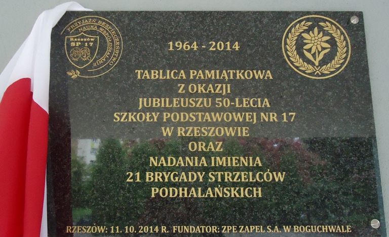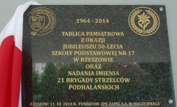 Podczas pierwszego dnia Patrona w Szkole Podstawowej nr 17 w Rzeszowie miało miejsce odsłonięcie i poświecenie tablicy pamiątkowej z okazji ostatniego Jubileuszu. Tablica ta umieszczona u wejścia do Szkoły została ufundowana przez ZPE ZAPEL w Boguchwale. Uroczystego odsłonięcia dokonali pan Roman Leśniak - Prezes Zarządu ZPE Zapel w Boguchwale i pani Barbara Filip, Dyrektor Szkoły Podstawowej Nr 17 z Oddziałami Integracyjnymi im. 21 Brygady Strzelców Podhalańskich w Rzeszowie.