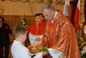 Na ręce Księdza Proboszcza dzieci złożyły dary ofiarne: płonącą świecę, kwiaty, chleb owoce oraz wino i wodę.