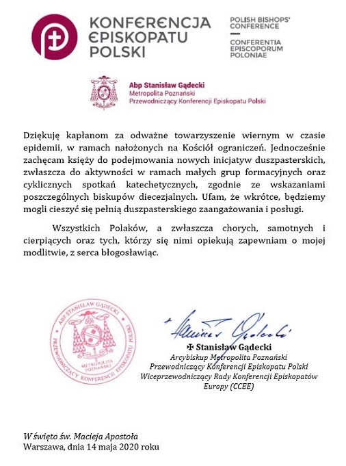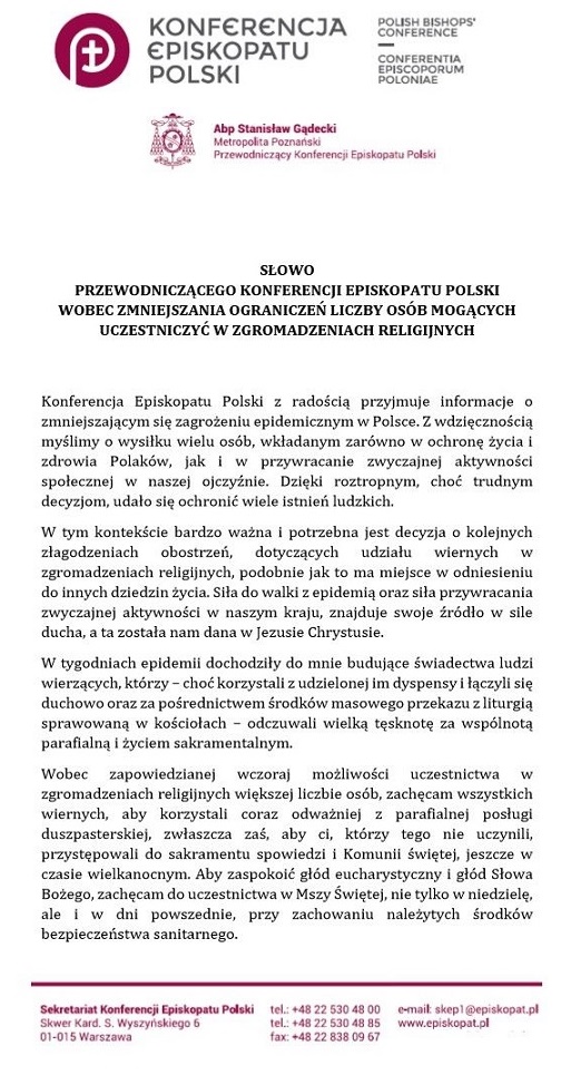 PRZEWODNICZĄCEGO KONFERENCJI EPISKOPATU POLSKI WOBEC ZMNIEJSZANIA OGRANICZEŃ LICZBY OSÓB MOGĄCYCH UCZESTNICZYĆ W ZGROMADZENIACH RELIGIJNYCH