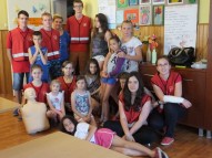 Dodatkowo w ramach trwającej półkolonii nasi wolontariusze przygotowali i poprowadzili dla dzieci zajęcia z zakresu pierwszej pomocy. Po raz pierwszy próbowaliśmy zachęcić dzieci i pokazać im co należy zrobić, gdy znajdzie się osobę poszkodowaną. Nie było to łatwe zadanie. Dzieci bardzo chętnie wzięły udział w przygotowanych zajęciach. Z wielką uwagąo bserwowali jak nasi wolontariusze prezentowali całe podejście do poszkodowanego, czy też pozycję bezpieczną.