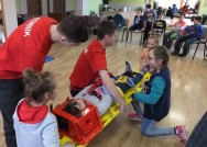 Dzieci wykazały się znakomitą wiedzą z zakresu pierwszej pomocy, a nasi wolontariusze przypomnieli resuscytacje krążeniowo- oddechową na fantomach oraz pozycje bezpieczną. Dużą radość wśród najmłodszych cieszyła się deska ortopedyczna oraz przedstawione przez naszego ratownika, a na co dzień strażaka Dawida sposoby wyciągania poszkodowanego z samochodu.