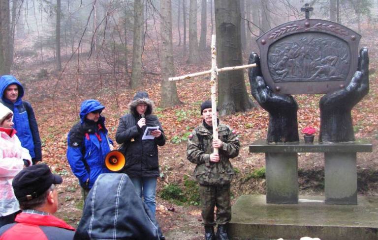 Wyruszyliśmy na trasę z Brzysk, z miejsca upamiętniającego poległych w tych okolicach żołnierzy w okresie I i II wojny światowej. Stąd już żółtym szlakiem, mijając kolejne stacje drogi krzyżowej szliśmy na szczyt góry Liwocz. Autorem projektu i wykonawcą stacji drogi krzyżowej jest artysta metaloplastyk Aram Shakhbazyan, z pochodzenia Ormianin, mieszkający w pobliżu Jasła. Każda ze stacji wykonana jest z miedzianej blachy metodą ręcznego wytłaczania. Całość umieszczona jest na wyciągniętych ku górze dłoniach, które z kolei wsparte są na ołtarzu, a wszystko to - w zamyśle autora - ma symbolizować, że na ołtarzu świata, ręce ludzkie ofiarowują Bogu Mękę Pańską, aby zaskarbić sobie jego miłosierdzie. Przed południem dotarliśmy na szczyt do sanktuarium Matki Bożej Królowej Pokoju, gdzie umieszczono figurę Matki Bożej przywiezioną tu z Medziugorja. Z tarasu położonego 20 metrów nad kaplicą, można podziwiać jeden z najrozleglejszych widoków na Pogórzu Ciężkowickim. Dookolna panorama pozwala nacieszyć się niezwykle pięknymi widokami najbliższych i dalszych okolic. Nam niestety takie widoki nie były dane z uwagi na gęstą i nisko wiszącą mgłę.