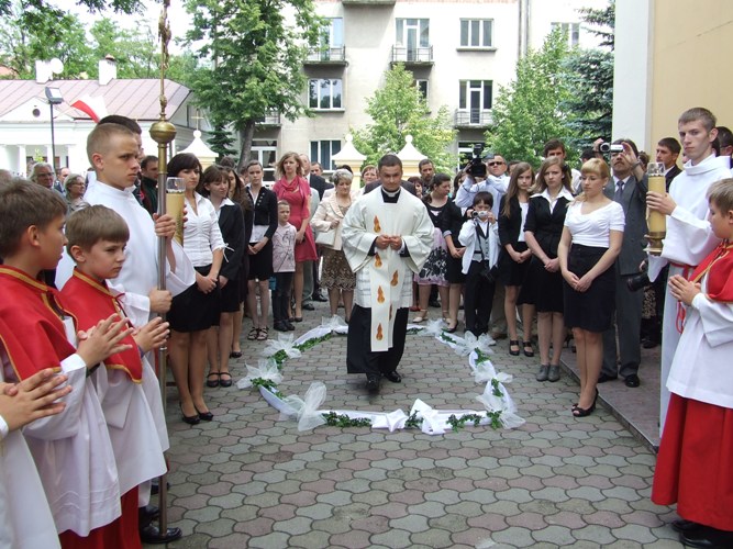 Prymicjant został powitany u progu parafialnej świątyni przez Proboszcza Parafii ks. płk. Tomasza Anisiewicza. Ta świątynia przez długi okres czasu była dla Ciebie domem. Tu przyjmowałeś sakramenty, a dziś te sakramenty sam będziesz tu sprawował. Ten kościół jest twoim domem. Takie jest też hasło duszpasterskie. Życzę Ci, aby każdy Kościół, każda parafia do której będziesz posłany przez naszego biskupa była zawsze Twoim domem powiedział ks. Proboszcz.