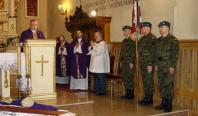 Oddajemy dziś hołd Żołnierzom Wyklętym, skazanym na zapomnienie, którzy doświadczyli okrutnych śledztw, pokazowych procesów, które były kpiną z wymiaru sprawiedliwości, a których wyrok był oczywisty - kara śmierci. Wspomnieć warto tu Generała Augusta Fieldorfa Nila, który był wspaniałym, dobrym żołnierzem i jednocześnie prawym i uczciwym człowiekiem. Dla najbliższych i żołnierzy był ucieleśnieniem wierności, honoru i odwagi. I także dzisiejszy żołnierz w chwilach trudnych, powinien odwoływać się do tej Postaci i jemu podobnych. Jego postawa życiowa niech będzie pomocą na ścieżce naszego życia i wskazówką jak postępować w życiu, by odwracając się za siebie nie wstydzić się. Kończąc Kaznodzieja zachęcił, byśmy zawsze szukali tego co w górze i by zawsze imponowała nam prawda, dobro, piękno, szlachetności świętość.