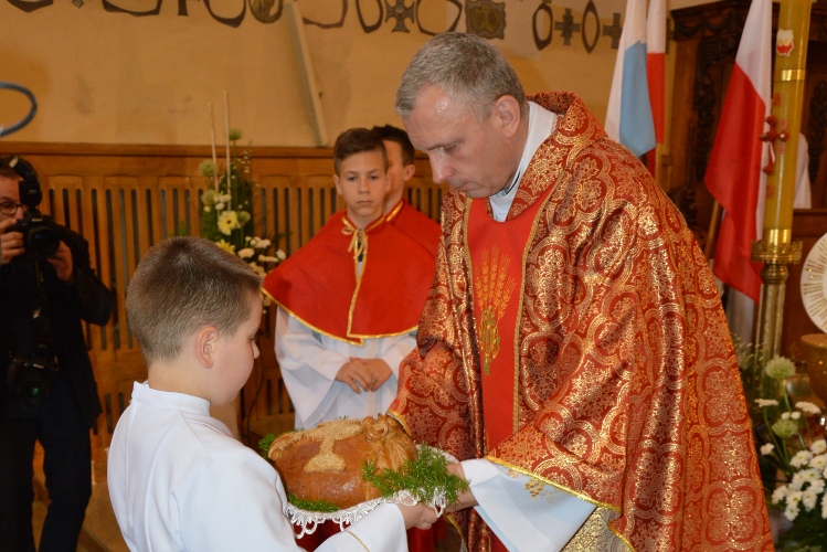 Na ręce Księdza Proboszcza dzieci złożyły dary ofiarne: płonącą świecę, kwiaty, chleb owoce oraz wino i wodę.