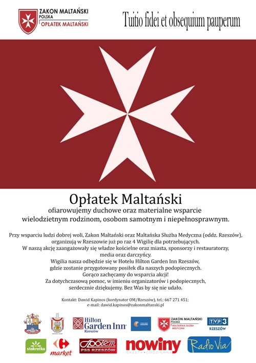 Jednym z punktów Opłatka Maltańskiego jest ofiarowanie duchowego i materialnego wsparcia osobom samotnym, starszym, niepełnosprawnym, rodzinom wielodzietnym. Podczas Opłatka Maltańskiego przychodzi Święty Mikołaj. Każda osoba dorosła oraz dzieci otrzymują paczki świąteczne. Paczka osoby dorosłej składa się z artykułów spożywczych a dzieci to: artykuły szkolne, zabawki, ubrania, słodycze. Całe przedsięwzięcie opłatkowe organizowane jest dzięki wielu, anonimowym darczyńcom włączających się w zbiórki żywności w sklepach oraz w akcję ?Podaruj?? prowadzoną w kościołach. Ponieważ bardzo ciężko jest pozyskać sponsorów na zakup niezbędnych rzeczy do paczek, dlatego też prowadzimy zbiórki w sklepach spożywczych. Do współpracy zaprosiliśmy rzeszowskie szkoły. Przyłączyło się I i III Liceum Ogólnokształcące w Rzeszowie.