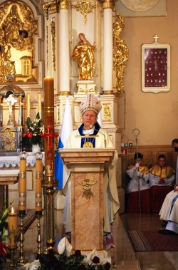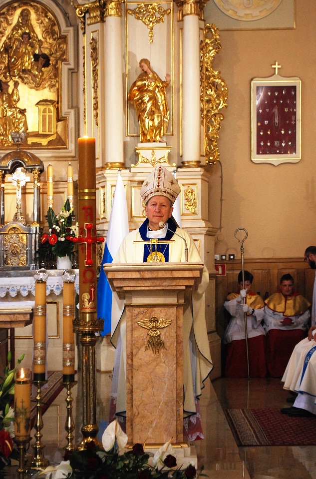 Podczas homilii ksiądz biskup skupił się na roli Matki Bożej w dziejach naszego państwa, mówił: Naród polski na przestrzeni dziejów doświadczył opieki Matki Bożej, o czym świadczy pierwszy hymn ?Bogurodzica Dziewica?, oraz Śluby Jasnogórskie Króla Kazimierza (?) Można dziś zapytać, do kogo należymy , my Polacy? Mówią o tym modlitwy i pieśni wznoszone za pośrednictwem Matki Chrystusa do Jej Syna. Bo taki jest nasz skarb ? Jezus Chrystus. (?) Daje nam Ona ? Matka jakby kodeks, który mamy przekazać następnym pokoleniom. To Ona z wysokości krzyża została matką Jana Apostoła i naszą matką. Byłoby tragiczne, gdyby Polacy zapomnieli, że króluje ukrzyżowany Chrystus i Matka Jego ? Królowa Polski. Następnie kaznodzieja nawiązał do pożaru katedry Norte Dame, ocalenia relikwii korony cierniowej i laicyzacji Europy. Mówił: Polska zdaje się dzisiaj odchodzić od swojej królowej, wchodząc do zjednoczonej Europy. Nie możemy zdradzić Maryi! Mamy obowiązek przekazywać wartości chrześcijańskie innym. Mamy budować nową ziemię i nowego człowieka. Nie możemy być obojętni, musi nas obchodzić Ewangelia. Głosił to nasz papież rodak Jan Paweł II w czasie swoich pielgrzymek. Homilię biskup zakończył cytatem z Hymnu brewiarza na święto Matki Bożej Królowej Polski: