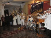 Po jasełkach wszyscy udali się do Sali Papieskiej gdzie przygotowana była agapa. Ksiądz Biskup złożył wszystkim życzenia i pobłogosławił opłatki i przy śpiewie kolęd w radosnym nastroju dzieliliśmy się wzajemnie opłatkiem składając sobie życzenia.