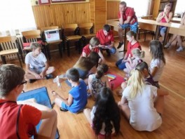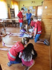 Dodatkowo w ramach trwającej półkolonii nasi wolontariusze przygotowali i poprowadzili dla dzieci zajęcia z zakresu pierwszej pomocy. Po raz pierwszy próbowaliśmy zachęcić dzieci i pokazać im co należy zrobić, gdy znajdzie się osobę poszkodowaną. Nie było to łatwe zadanie. Dzieci bardzo chętnie wzięły udział w przygotowanych zajęciach. Z wielką uwagąo bserwowali jak nasi wolontariusze prezentowali całe podejście do poszkodowanego, czy też pozycję bezpieczną.